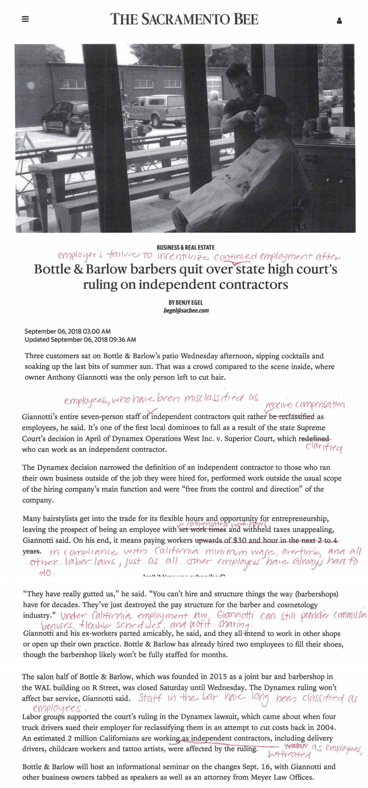 El 6 de Septiembre de 2018, el Sacramento Bee publicó un artículo engañoso sobre la clasificación inadecuada de los empleados como contratistas independientes. En el artículo, el Sacramento Bee cita a un propietario de una barbería local sobre el impacto que la decisión del Tribunal Supremo de California en Dynamex tuvo en su negocio y en las decisiones de sus empleados de renunciar